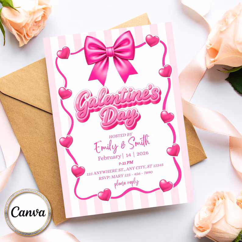 Pink Bow Galentine’s Day Party Invitation, Galentine’s Night Party Invite, Valentine’s Day, Doodle Hand Drawn, Invitation, Editable Canva